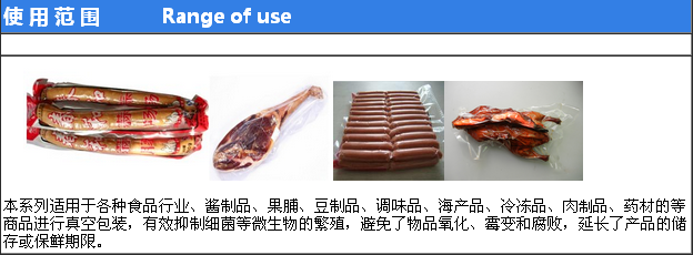該機適 用如:肉類加工、醬腌產品、水產、海產品加工、蔬菜加工、農副產品加工、果脯、糧食、豆制品、藥材、電器、化學制品等顆粒、粉狀、液體等食品進行真空后充惰性氣體包裝、可以防止產品氧化霉變、腐敗、防潮達到延長產品的儲存期限。